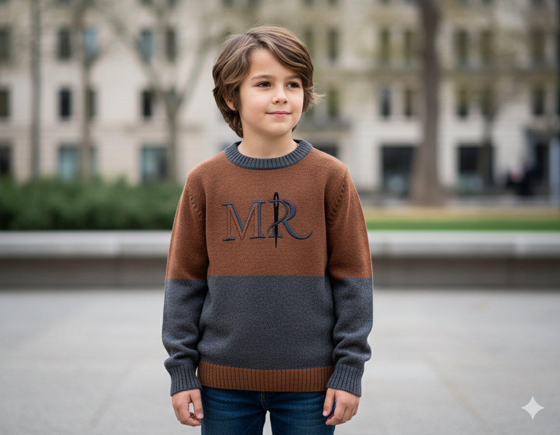 بلوفر محبوك يجمع بين دفء اللون البني وأناقة الرمادي، مزين بشعار العلامة المميز.