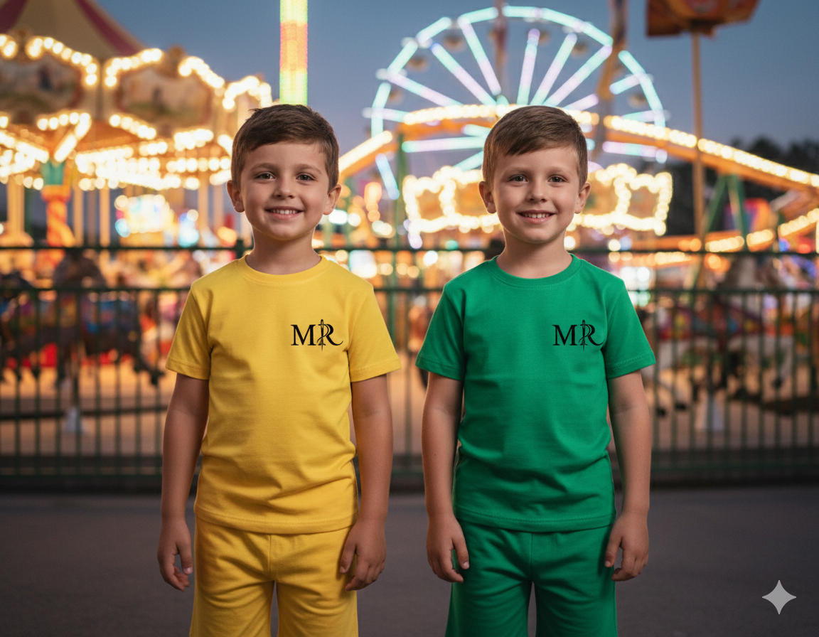 شورتات قطنية بألوان صيفية زاهية مع تيشيرت أبيض مطبوع عليه الشعار، مثالية للخروجات اليومية.