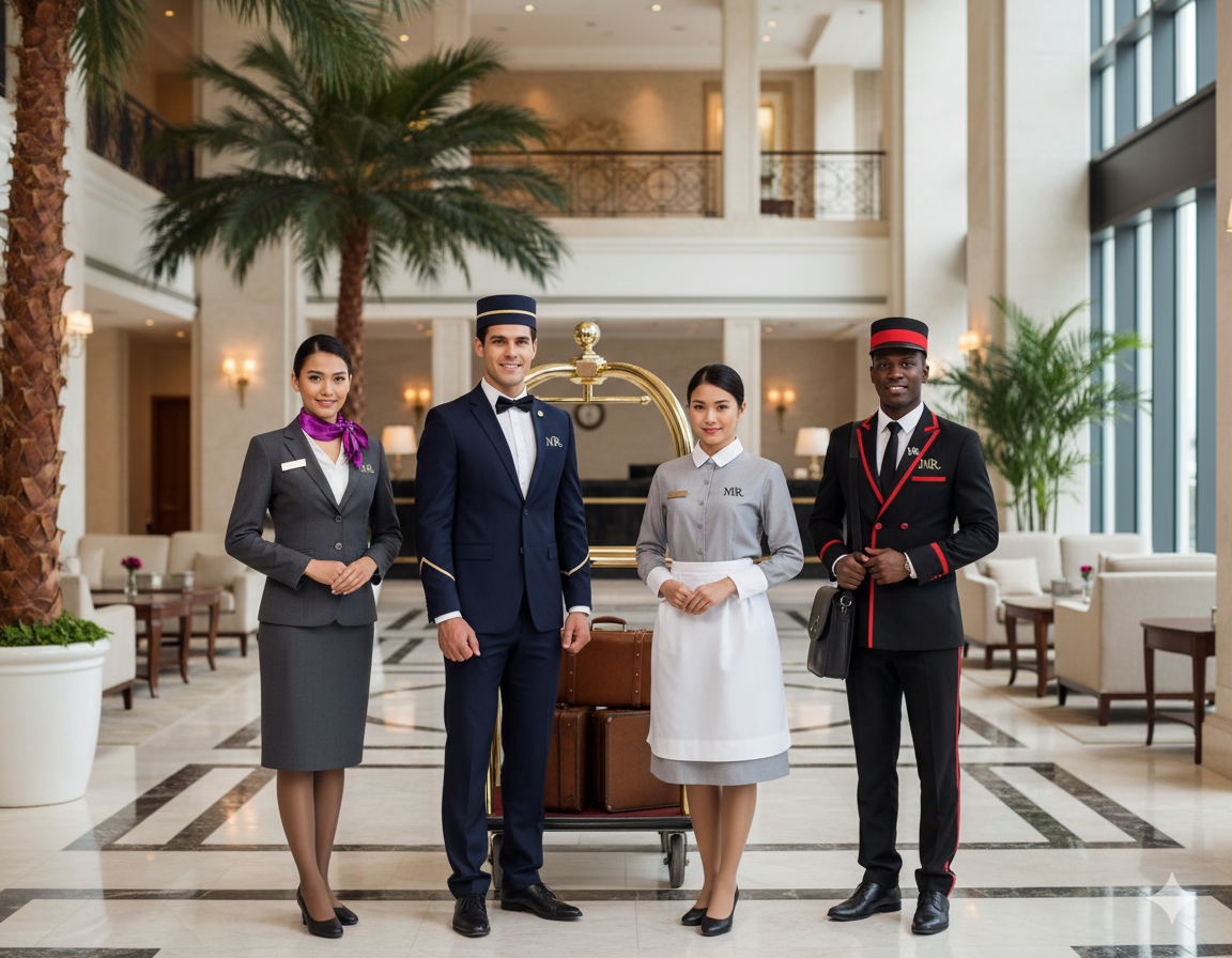 نضفي لمسة من الأناقة والفخامة على تجربة ضيوفكم. صُممت أزياء طاقم الفندق لدينا بعناية فائقة لتجمع بين المظهر الراقي والعملية، مما يضمن ظهور موظفيكم بأفضل صورة تليق بخدمات الفنادق المتميزة.”